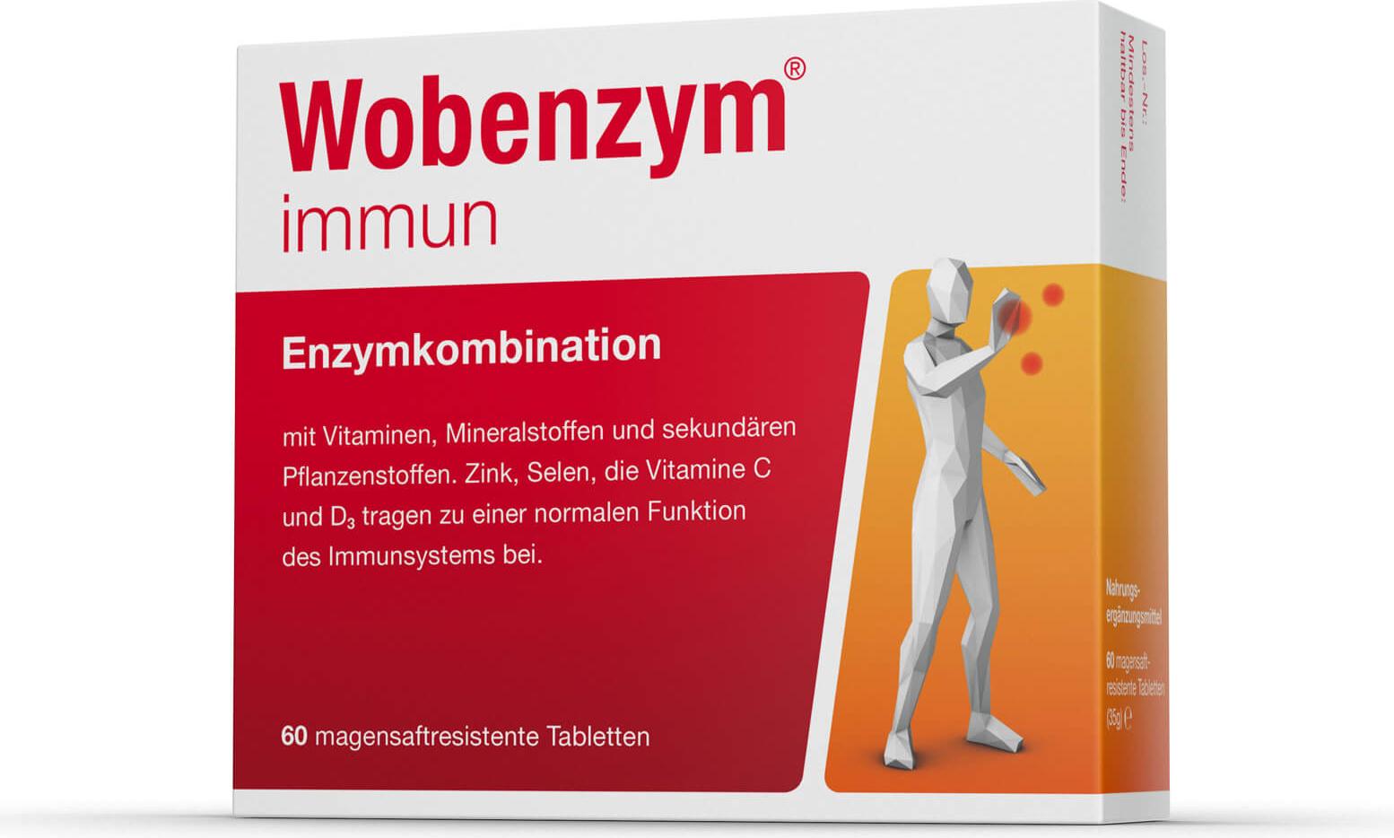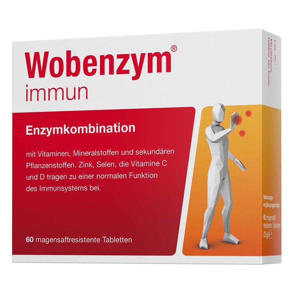 MUCOS Pharma GmbH & Co. KG - EAN: 4030142030609 - Wobenzym Immun Zur Unterstützung des ImmunsystemsDie Tabletten dienen der Unterstützung des Immunsystems und dem Erhalt einer funktionsfähigen Immunabwehr bei unausgewogener Ernährung, in der kalten Jahreszeit und zur Vorbereitung auf die Pollenflugsaison.Auch bei Sportlern im Training, bei älteren Menschen, deren Immunsystem nicht mehr so reaktionsfähig ist, oder bei Rauchern können diese Tabletten helfen.Für die Abwehkraft enthält Wobenzym immun: die Wobenzym-Enzymkombination, wichtige Vitamine und Mineralstoffe und wertvolle Pflanzenstoffe.Anwendung:3x 2 Tabletten pro Tag mit ausreichend Flüssigkeit unzerkaut verzehren. Damit die Enzyme optimal aufgenommen werden, Wobenzym immun außerhalb der üblichen Mahlzeiten verzehren (45 Minuten vor dem Essen und mindestens 90 Minuten nach dem Essen). Pflichttext: Wobenzym Immun Nahrungsergänzungsmittel sollten nicht als Ersatz für eine ausgewogene und abwechslungsreiche Ernährung verwendet werden oder eine gesunde Lebensweise ersetzen. Zusammensetzung: Wobenzym Immun(~kR~k,~kR~k,~kR~k)-a63-Tocopherol-äquivalent, Aromastoffe, natürlich, naturidentisch, Ascorbinsäure, Beta-Glucan, Bromelain, Calciumcarbonat, Cellulose, Colecalciferol, Ethylcellulose, Hyprolose, Hypromellose, Isomalt, Natrium alginat, Natriumselenit, ölsäure, Papain, Polyphenole, Quercetin, Saccharomyces cerevisiae, Selen(IV)-Ion, Siliciumdioxid, Speisefettsäuren, Magnesiumsalze, Stearinsäure, Traubenkern-Extrakt, ... Dieses eBay-Angebot für 60 Tabletten zu 27.09 Euro ist eine weitere Option für eine kleinere Menge. ![]() ![]() WOBENZYM immun - magensaftresistente Tabletten, eBay 60 St PZN 15421635