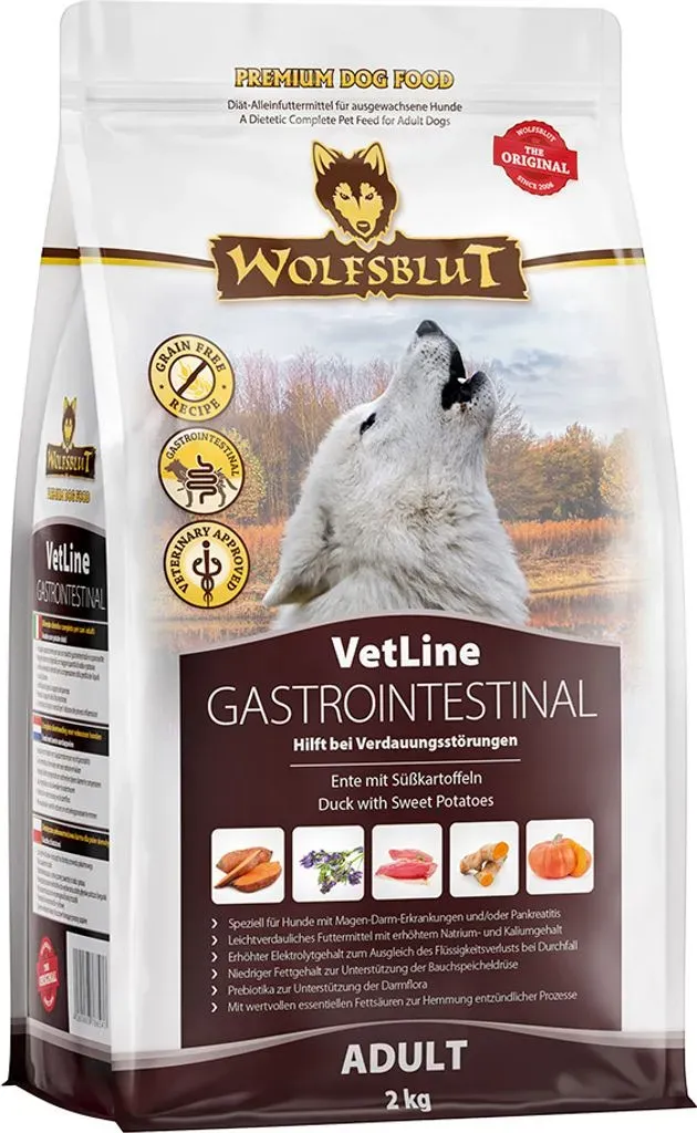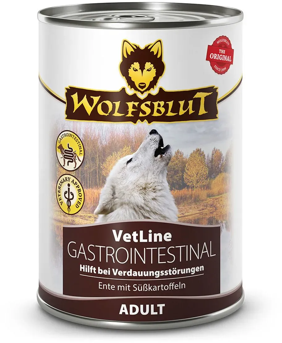 7 Händlerangebote bei billiger.de - Kategorie: Hundefutter - Wolfsblut - Mit Tierärzten entwickelt: Rezeptur mit natürlichen Inhaltsstoffen Speziell für Hunde mit Magen-Darm-Erkrankungen und/oder Pankreatitis Leichtverdauliches Futtermittel mit erhöhtem Natrium- und Kaliumgehalt entlastet Magen- und Darmtrakt Frische und leicht bekömmliche Ente als Hauptbestandteil Niedriger Fettgehalt, welcher zwingend notwendig ist zur Unterstützung der Bauchspeicheldrüse Erhöhter Elektrolytgehalt, um den Hund mit ausreichend Mineralstoffen zu versorgen und Elektrolytverluste (zum Beispiel durch Durchfall) auszugleichen und das Wohlbefinden zu steigern Mannan-Oligosaccharide (MOS) stärken die Darmflora und sorgen dafür die bakterielle Besiedlung im Darm im Gleichgewicht zu halten Enthält wichtige essenzielle Fettsäuren, um entzündliche Prozesse zu verringern und dadurch die verbleibende Leistung der Bauchspeicheldrüse zu stärken Ohne Mais, Gluten, Soja, Geschmacksverstärkern & künstlichen Zusätzen (ausgenommen Vitamine & Mineralstoffe) Getreidefreie Rezeptur, da es im natürlichen Beuteschema des Urahns des Hundes nicht vorkommt und zudem zu den häufigsten Allergieauslösern bei Hunden zählt - GTIN:4260603786541 ![]() Wolfsblut VetLine Gastrointestinal Ente 2kg