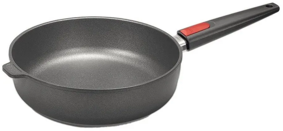 Verfügbarkeit: Auf Lager - Kategorie: Pfannen - WOLL - GTIN:0705184504268 - HOHER RAND FüR VIEL VOLUMEN: Mit 28 cm Durchmesser und 7 cm Höhe eignet sich die Hochrandpfanne ideal für Pfannengerichte, Currys, Pasta oder Schmorgerichte. Viel Platz für Familienportionen. ANTIHAFT-BESCHICHTUNG: Die Titanium-Versiegelung ist extrem kratzfest und verhindert Ankleben. Braten gelingt mit wenig Fett, die Reinigung ist besonders einfach. ALUGUSS-QUALITäT: Massiver Aluminiumguss sorgt für gleichmäßige Hitzeverteilung und hohe Energieeffizienz. Die Pfanne ist robust, langlebig und formstabil. BACKOFENFEST BIS 300 °C: Mit abnehmbarem Stiel flexibel nutzbar. Ideal für Rezepte, die auf dem Herd beginnen und im Ofen fertiggestellt werden. FüR ALLE HERDARTEN: Geeignet für Induktion, Gas, Ceran und Elektro. Universell einsetzbar für den täglichen Gebrauch. - 124,95 Euro bei Amazon Marketplace Home - gefunden von billiger.de Diese Guss-Hochrandpfanne Induction Line bietet einen abnehmbaren Stiel und ist mit 139.99 Euro eine hochwertige Option für Induktionsherde. ![]() ![]() WOLL Bratpfanne Guss-Hochrandpfanne Induction Line, Aluminium-Guss (Stück, 1-tlg), mit abnehmbarem Stiel schwarz Ø 28 cm x 7 cm