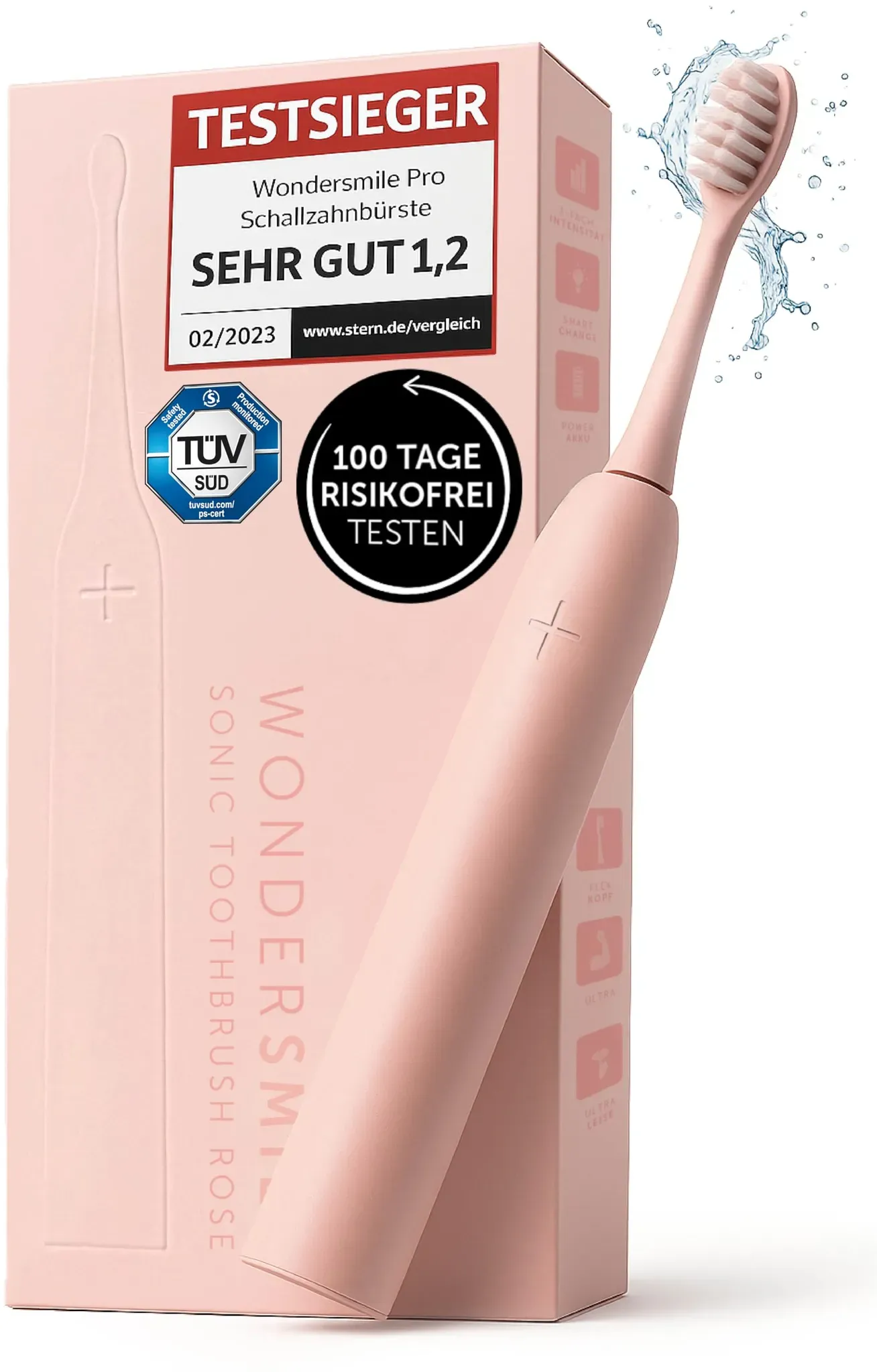 Kategorie: Elektrische Zahnbürsten - wondersmile - GTIN:4270002781276 - EFFEKTIVE SCHALLTECHNOLOGIE FüR DEIN WONDERSMILE - Die Schallzahnbürste bietet 4 verschiedene Programme mit je 3 Intensitätsstufen. Auch geeignet für empfindliche Zähne, Füllungen oder Kronen. 40.000 UMDREHUNGEN/MINUTE - Unser Bürstenkopf bewegt sich mit bis zu 40.000 Vibrationen pro Minute. Verfärbungen, Rückstände & Plaque werden so schonend und zuverlässig entfernt. DIE BESTE TECHNOLOGIE IN DEINEM BADEZIMMER - Der smarte Bürstenkopf Sensor bietet eine Erinnerungsfunktion. Er erkennt und zeigt dir an, wann du deinen Bürstenkopf austauschen solltest. 60 TAGE POWER AKKU - Der Wonderbrush Power Akku begeistert durch Ausdauer. Mit nur einer Ladung kannst du bis zu 60 Tage putzen. Lange Reisen sind so auch ohne Ladestation möglich. SPARSET ENTDECKEN - für optimale Zahn- & Zahnfleischpflege empfehlen wir das Sparset, bestehend aus Schallzahnbürste & Munddusche - 59,99 Euro bei Amazon Marketplace Health & Personal Care - gefunden von billiger.de Für 69,90 Euro erhalten Sie hier eine einzelne Wondersmile Schallzahnbürste PRO in "Atomic Rose", die als Testsieger 2025 beworben wird und eine lange Akkulaufzeit verspricht. ![]() ![]() Wondersmile Schallzahnbürste PRO - Testsieger 2025-100 Tage risikofrei testen - TüV-geprüft - Elektrische Zahnbürste, 4 Programme - 60 Tage Power Batterie mit Smart-Bürstenkopf (Atomic Rose)