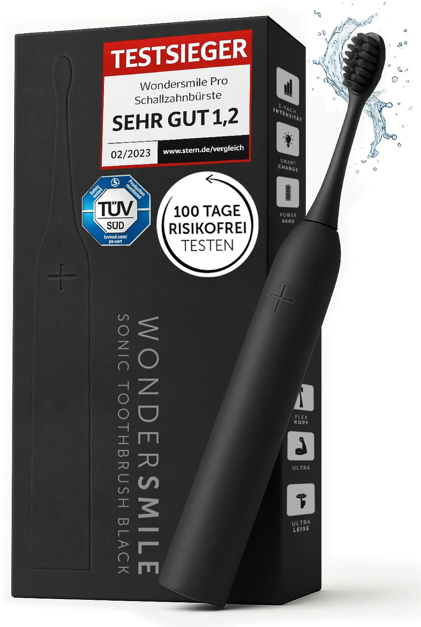 Kategorie: Elektrische Zahnbürsten - wondersmile - GTIN:4270002781290 - EFFEKTIVE SCHALLTECHNOLOGIE FüR DEIN WONDERSMILE - Die Schallzahnbürste bietet 4 verschiedene Programme mit je 3 Intensitätsstufen. Auch geeignet für empfindliche Zähne, Füllungen oder Kronen. 40.000 UMDREHUNGEN/MINUTE - Unser Bürstenkopf bewegt sich mit bis zu 40.000 Vibrationen pro Minute. Verfärbungen, Rückstände & Plaque werden so schonend und zuverlässig entfernt. DIE BESTE TECHNOLOGIE IN DEINEM BADEZIMMER - Der smarte Bürstenkopf Sensor bietet eine Erinnerungsfunktion. Er erkennt und zeigt dir an, wann du deinen Bürstenkopf austauschen solltest. 60 TAGE POWER AKKU - Der Wonderbrush Power Akku begeistert durch Ausdauer. Mit nur einer Ladung kannst du bis zu 60 Tage putzen. Lange Reisen sind so auch ohne Ladestation möglich. SPARSET ENTDECKEN - für optimale Zahn- & Zahnfleischpflege empfehlen wir das Sparset, bestehend aus Schallzahnbürste & Munddusche Ausgezeichneter Kundenservice NTV Award 2025 Testsieger: 1. Platz im Kundensupport unter 9 Anbietern schnelle Hilfe, kompetente Beratung & höchste Kundenzufriedenheit. - 69,90 Euro bei Amazon Marketplace Automotive - gefunden von billiger.de Dieses Angebot ist ein Standardmodell der Wondersmile Schallzahnbürste PRO zu einem fairen Preis, inklusive 100 Tage risikofreiem Testen. ![]() ![]() Wondersmile Schallzahnbürste PRO - Testsieger 2025-100 Tage risikofrei testen - TüV-geprüft - Elektrische Zahnbürste, 4 Programme - 60 Tage Power Batterie mit Smart-Bürstenkopf (Ultimate Black)
