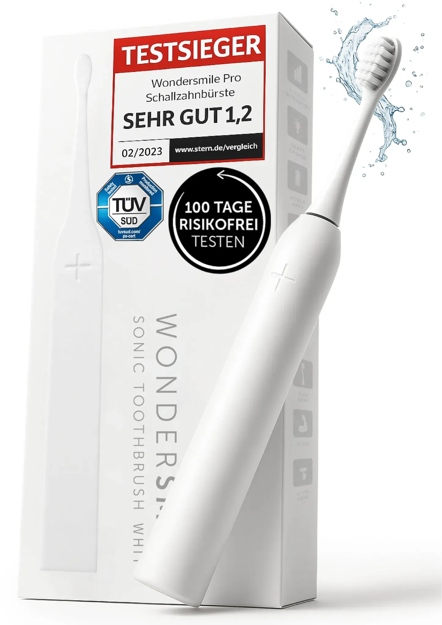 Dieses Angebot ist ein Beispiel für Angebote, die kürzlich auf dem eBay-Marktplatz in der Kategorie 260774 verfügbar waren. Bitte aktualisieren Sie die Suchergebnisse um aktuelle Angebote zu erhalten. Die Wondersmile Schallzahnbürste PRO in All White ist hier zu einem gängigen Preis erhältlich, ebenfalls mit der Option zum risikofreien Testen. ![]() ![]() Wondersmile Schallzahnbürste PRO - Testsieger 2025-100 Tage risikofrei testen - TüV-geprüft - Elektrische Zahnbürste, 4 Programme - 60 Tage Power Batterie mit Smart-Bürstenkopf (All White)