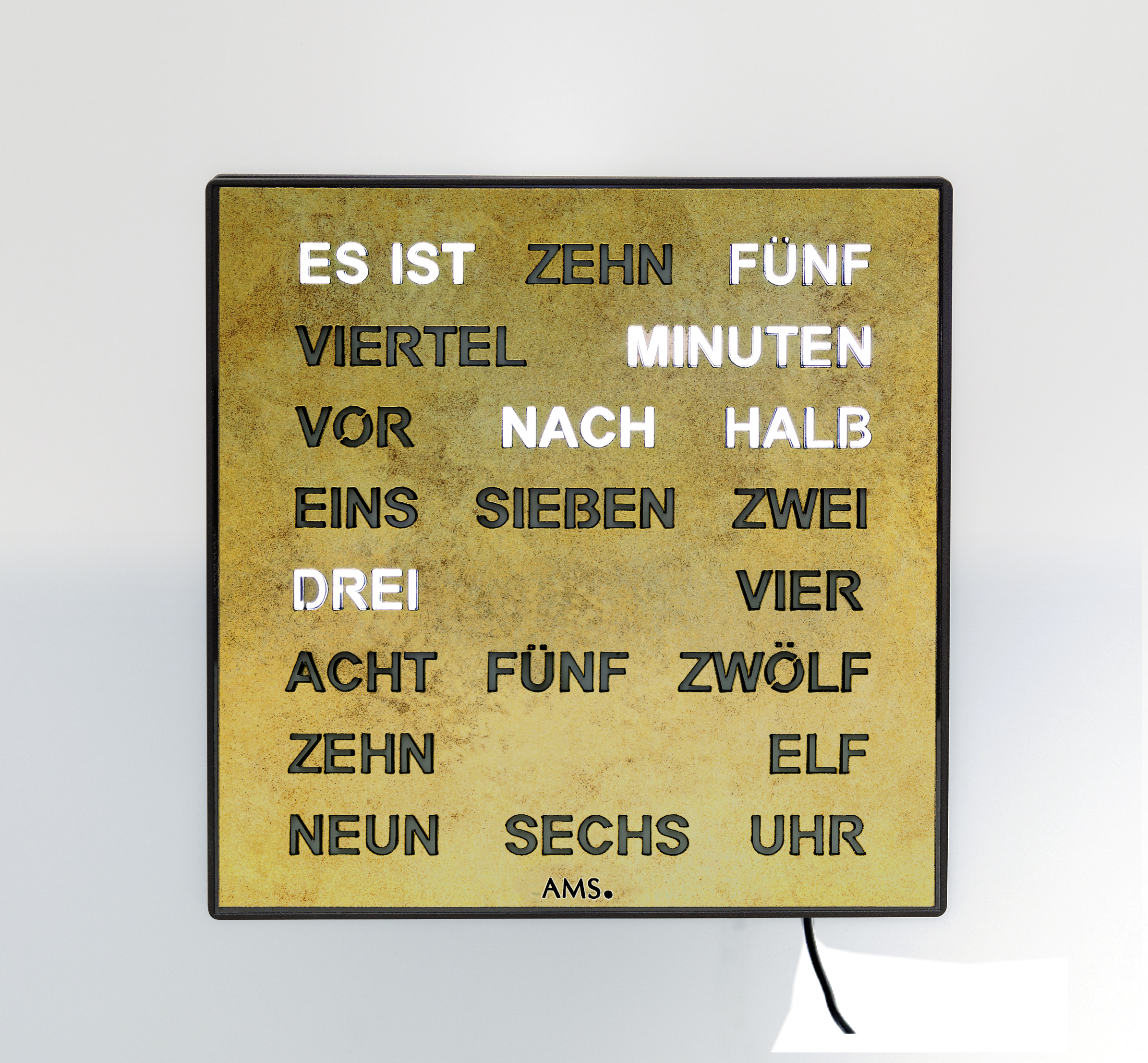 EAN: 4037445158788 - AMS Wortuhr. Die Uhrzeit wird in Worten angezeigt. Als Wand- oder Tischuhr nutzbar. Deutsche Version.Marke: AMS Uhren Gehäusefarbe: schwarz Glas: Acrylglas Material Gehäuse: Metall Uhrwerktyp: Quarz Abmessungen: 28 x 28 x 4 cmInkl. 220V Netzteil. - Quarzwerk mit 220V Adapter - Kunststoffgehäuse - Wortuhr mit LED Ziffern - Gewicht: 0,9kg - Maße: 28 x 28 x 4 cm - EAN: 4037445158788 Die AMS 1235 Tischuhr ist keine normale Tischuhr. Bei diesem Modell handelt es sich um eine Wortuhr. Die Uhrzeit wird nicht in Ziffern, sondern in Worten angezeigt. Die Wörter werden auf dem schwarzen LED Zifferblatt beleuchtet. Das macht die AMS 1235 Wortuhr zu einem Hingucker in jeder Wohnung. Die Tischuhr wird nicht mit einer Batterie sondern durch ein Netzteil angetrieben. - bei kaufland.de - aus Yadore Produktdaten Für 184,99 Euro erhalten Sie eine moderne Wortuhr mit App-Steuerung (iOS/Android), die individuelle Anpassungen ermöglicht. ![]() ![]() Wortuhr mit - App-Steuerung (IOS/Android) eBay - LED / Deutsch
