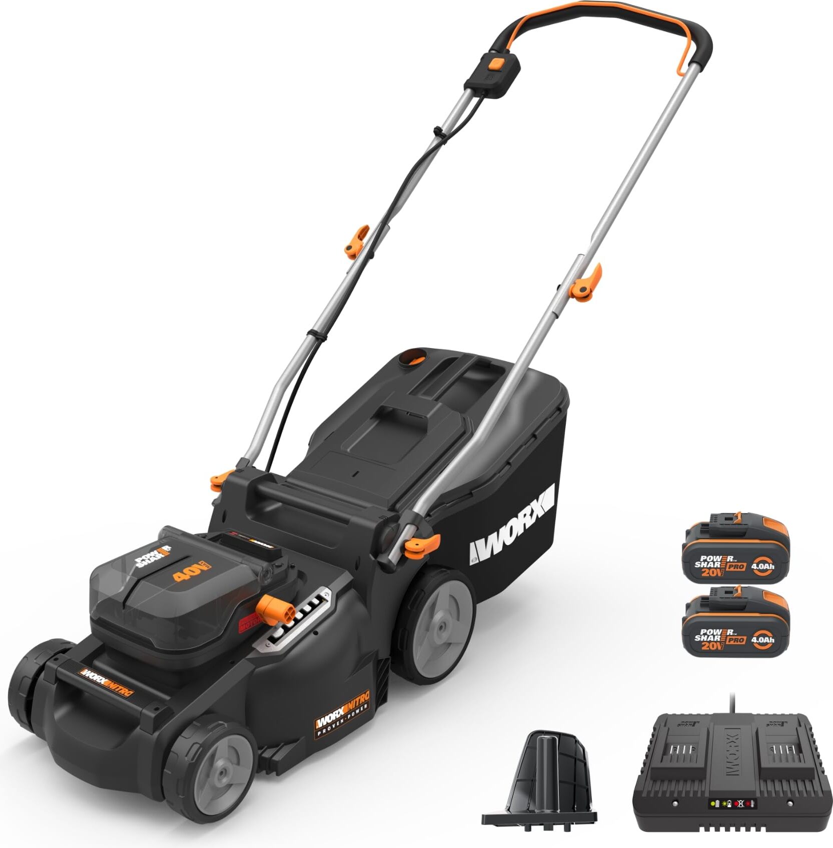Auf Lager Versand durch AmazonWORX WG745E Akku-Rasenmäher 40V, 41cm Schnittbreite, 50L Grasfangkorb (leistungsstarker Brushless-Motor, 6 Schnitthöheneinstellungen (25-80mm), Intellicut Technologie, inkl. 2X 4Ah Akku & Ladegerät)