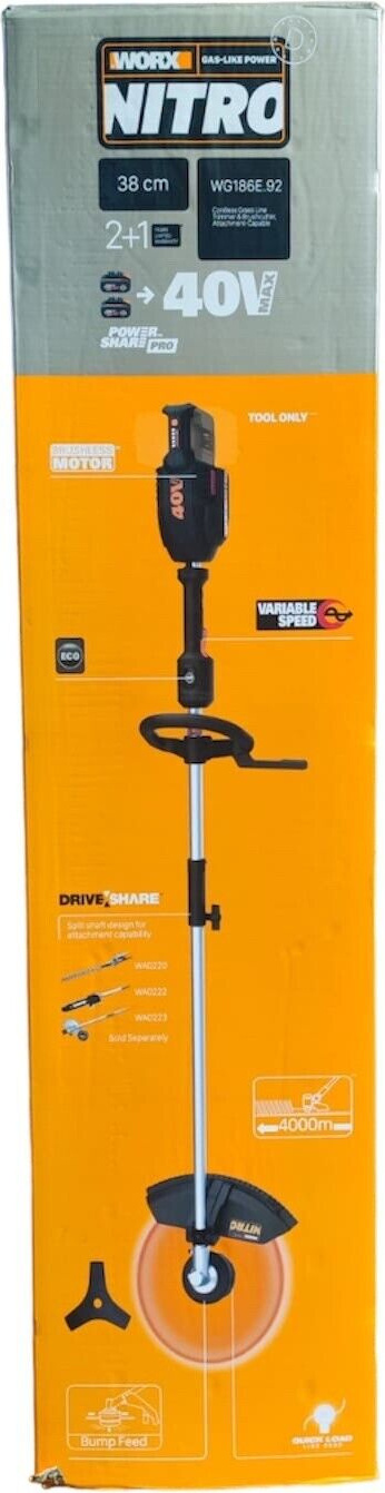 WORX - EAN: 06943475880644 - WORX NITRO WG186E.9 - Akku-Rasentrimmer - 40V - 38-25 cm - SOLO - OHNE AKKU UND LADEGERäT. - bei agrieuro.de - aus Yadore Produktdaten ![]() ![]()
