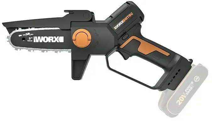 Auf Lager Versand durch AmazonWORX NITRO WG325E.1 Mini-Kettensäge 20V, Einhand Kettensäge, bürstenloser Motor, 12cm Schwertlänge, inkl. PowerShare Akku, Ladegerät & 125cm Verlängerungsstange