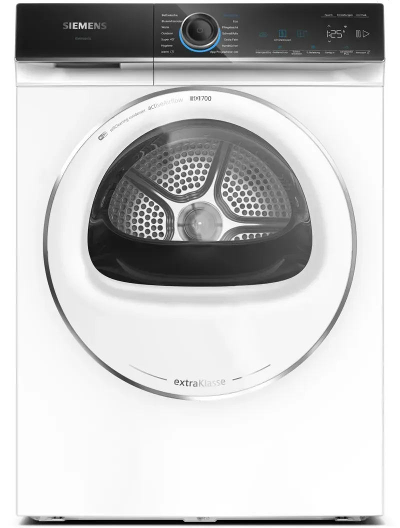 5 Händlerangebote bei billiger.de - EEK: A - Kategorie: Wärmepumpentrockner - Siemens - Siemens iQ700 WR47B2C90 topTeam, Freistehend, Frontlader, Wärmepumpe, Weiß, Drehregler, Berührung, Rechts Siemens iQ700 WR47B2C90 topTeam. Geräteplatzierung: Freistehend, Ladetyp: Frontlader, Trocknungssystem: Wärmepumpe. Nennkapazität: 9 kg, Kondensationseffizienzklasse: A, Trockenprogramme: Bluse/Shirt, Baumwolle, Cotton eco, Feinwäsche/Seide, Pflegeleicht, Mix, Schnell, Handtuch, Wolle. Einschalteverzögerung (max.): 24 h, Bedienung durch Apps unterstützt: Siemens Home Connect. Energieeffizienzklasse: A, Energieverbrauch pro 100 Zyklen: 79 kWh, Energieverbrauch: 0,79 kWh. Tiefe: 627 mm, Breite: 598 mm, Höhe: 842 mm iQ700 Wärmepumpen-Trockner 9 kg - GTIN:4242003975244 ![]() ![]() Siemens iQ700 WR47B2C90 Wärmepumpen Trockner Frontlader AutoClean (inkl. Lieferung zum Aufstellungsort)