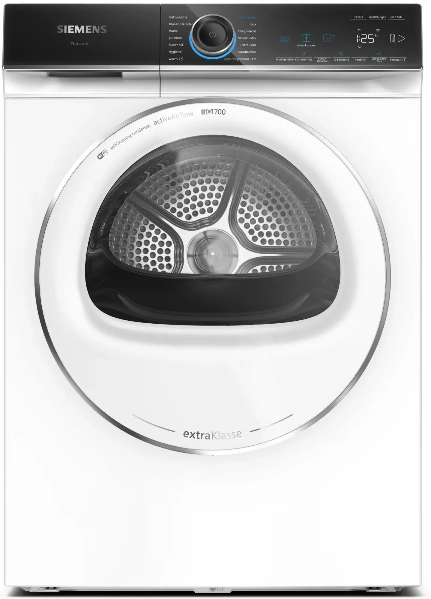 EEK: A - Kategorie: Wärmepumpentrockner - Siemens - GTIN:4242003975244 - Allgemein * Gerätetyp: Kondensation * Wärmepumpen-Trockner * Maximale Beladungsmenge: 9.0 kg * Farbe: Weiß * Trommelstruktur: ja * Türanschlag: Rechts wechselbar * Bedienelemente: Drehkontrolle, Per App * Weitere Bedienungsmöglichkeiten: Baumwolle, Sheets, Blusen/Hemden, Baumwolle Eco, Dessous, Handtücher, Hygiene, Mix, Sport, Programm für Wolle, Super 40, Synthetik, Zeitprogramm warm * Geräuschwert: 57 dB(A) re 1 pW * Geräusch-Effizienzklasse: A * Energieeffizienzklasse: A * Kondensationseffizienzklasse: A * Kondensationseffizienz (EU 2017/1369): 95 % * Komfort-Ablaufgarnitur * Ablauf-Schlauch für Kondenswasser Maße & Gewicht * Abmessungen des Gerätes: 842 x 598 x 627 mm * Abmessungen des verpackten Gerätes: 890 x 620 x 670 mm * Tiefe bei geöffneter Tür (90 ): 1119 mm * Trommelvolumen: 112 l * Arbeitsplatte abnehmbar: Nein * Abluftschlauch: Nein * Höhenverstellung max.: 15 mm * Nettogewicht: 55 kg * Länge Anschlusskabel: - 1199,00 Euro bei holzleitner.de - gefunden von billiger.de ![]() Siemens iQ700 WR47B2C90 Wärmepumpen Trockner Frontlader AutoClean (inkl. Lieferung zum Aufstellungsort)
