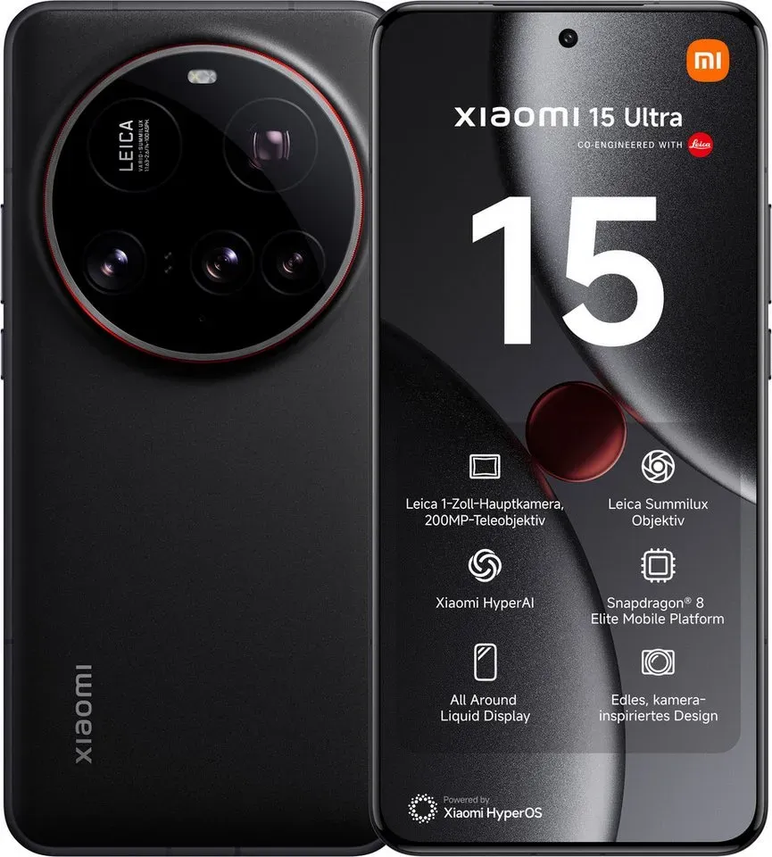 Zustand: Neu - Simlockfreie Handys - XIAOMI Xiaomi - 6932554434113 - EAN: 6932554434113 - Leica Kamerasystem: Hochmodernes mobiles Holy Trinity Objektiv-Set mit Leica Summilux Optik und 200MP Super-Teleobjektiv - für atemberaubende Aufnahmen mit höchster Qualität Snapdragon 8 Elite Flaggschiff-Prozessor: Leistungsstarke 3nm Mobilplattform für eine revolutionäre Performance, optimiert für Gaming, Multitasking und maximale Effizienz Display & Schultz: CrystalRes Dynamisches 1-120Hz AMOLED Display + Xiaomi Shield Glass 2.0 - Super energieeffizientes WQHD+ Panel mit ultradünnem Rahmen, verbessertem Schutz und ultraschnellem Ultraschall-Fingerabdrucksensor für ein erstklassiges Seherlebnis Leistungsstarker Akku + Schnellladefunktion: 5410mAh Xiaomi Surge Akku mit 90W kabelgebundenem HyperCharge und 80W kabellosem HyperCharge - für extreme Ausdauer und blitzschnelles Laden unterwegs Xiaomi HyperAI: Intelligente AI-gestützte Technologie für eine optimierte Kamera, smartere Leistung und ein flüssiges Nutzererlebnis ohne Verzögerungen powered by Xiaomi HyperOS 2.0 Rundum flüssiges Design: Elegantes Xiaomi Mobiltelefon mit Xiaomi Shield Glass, ultradünnem Display-Rahmen und Xiaomi Schutzstruktur - Premium-Design mit robuster Verarbeitung Lieferumfang: 1x Xiaomi 15 Ultra Gerät, fest verbauter Akku, SIM-Pin, Benutzerhandbuch, karte, USB-C Kabel, Ringhalter & Schutzhülle - Ladegerät nicht enthalten Exklusives Angebot (02.03.-16.03.)! Kaufen Sie ein Xiaomi 15 Series Smartphone und ... Media Markt Online Shop bietet das Xiaomi 15 Ultra mit 512GB in Schwarz, eine gute Wahl für Kunden, die bei einem bekannten Händler kaufen möchten. ![]() ![]() XIAOMI 15 Ultra 512 GB Black Dual SIM