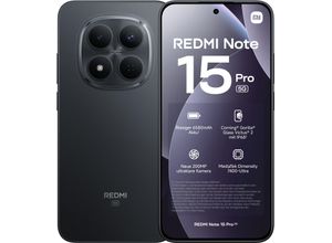 Audio Hifi Lifestyle Technik - - Bildschirm: Bildschirmdiagonale in Zoll: 6,83 ″, Bildschirmdiagonale in Zentimeter: 17,34 cm, Bildschirmauflösung in Pixel: 2772 x 1280 px, Auflösungsstandard: FHD+, Bildschirmtechnologie: AMOLED, Bildschirmhelligkeit: 3.200 cd/m², Bildschirmmaterial: Gorilla® Glass Victus® 2, Anzahl Displays: 1, Software: Betriebssystem: HyperOS 2, App Store: Google Play Store, Speicher: Arbeitsspeicher (RAM): 8 GB, Speicherkapazität: 256 GB, Prozessor: Prozessorhersteller: Mediatek, Prozessorname: Helio G200, Prozessorserie: Ultra, Prozessorarchitektur: 6 nm, Audio- und Videowiedergabe: Lautsprecherkanäle: Stereo, Netzwerk- und Verbindungsarten: Ortungstechnologie: GLONASS, GPS, QZSS, GSM-Band: 850, 900, 1800, 1900, Simkartentyp: Nano-SIM, Simkartenvariante: Dual-SIM, Netzwerkstandard: Bluetooth, NFC, Netzwerkfunktionalität: Bluetooth, OTG, WiFi Direct, Wi-Fi-Standard: a, b, g, n, ac, Bluetooth-Version: 5.4, Audio- und Videoaufnahme: Auflösung Hauptkamera: 200, Auflösung Hauptkamera 2: 8, Auflösung Hauptkamera 3: 2 MP, Auflösung Frontkamera: 32 MP, Videoaufnahmequalität: 1080p, Aufnahmearten: HDR, Panorama, Anzahl Frontkameras: 1, Anzahl Hauptkameras: 3, Integriertes Hilfslicht: LED-Blitz, Anzahl Linsen der Hauptkamera: 3, Brennweite maximal: 92 mm, Zoomfaktor optisch Hauptkamera: 4 fach, Lichtstärke minimal: f2,2, Anschlüsse: Unterstützte USB-Version: 2.0, Typ Anschluss: USB Typ C, Allgemein: Schutzart: IP65 (Staub- und Strahlwasserschutz), ... Das XIAOMI Smartphone Redmi Note 15 Pro 5G bietet eine hohe Speicherkapazität und 5G-Konnektivität für ein reibungsloses Nutzererlebnis. ![]() XIAOMI Smartphone 'Redmi Note 15 Pro 5G 8+256', Energieeffizienz: B (A-G), schwarz, 256 GB, Mobiltelefone