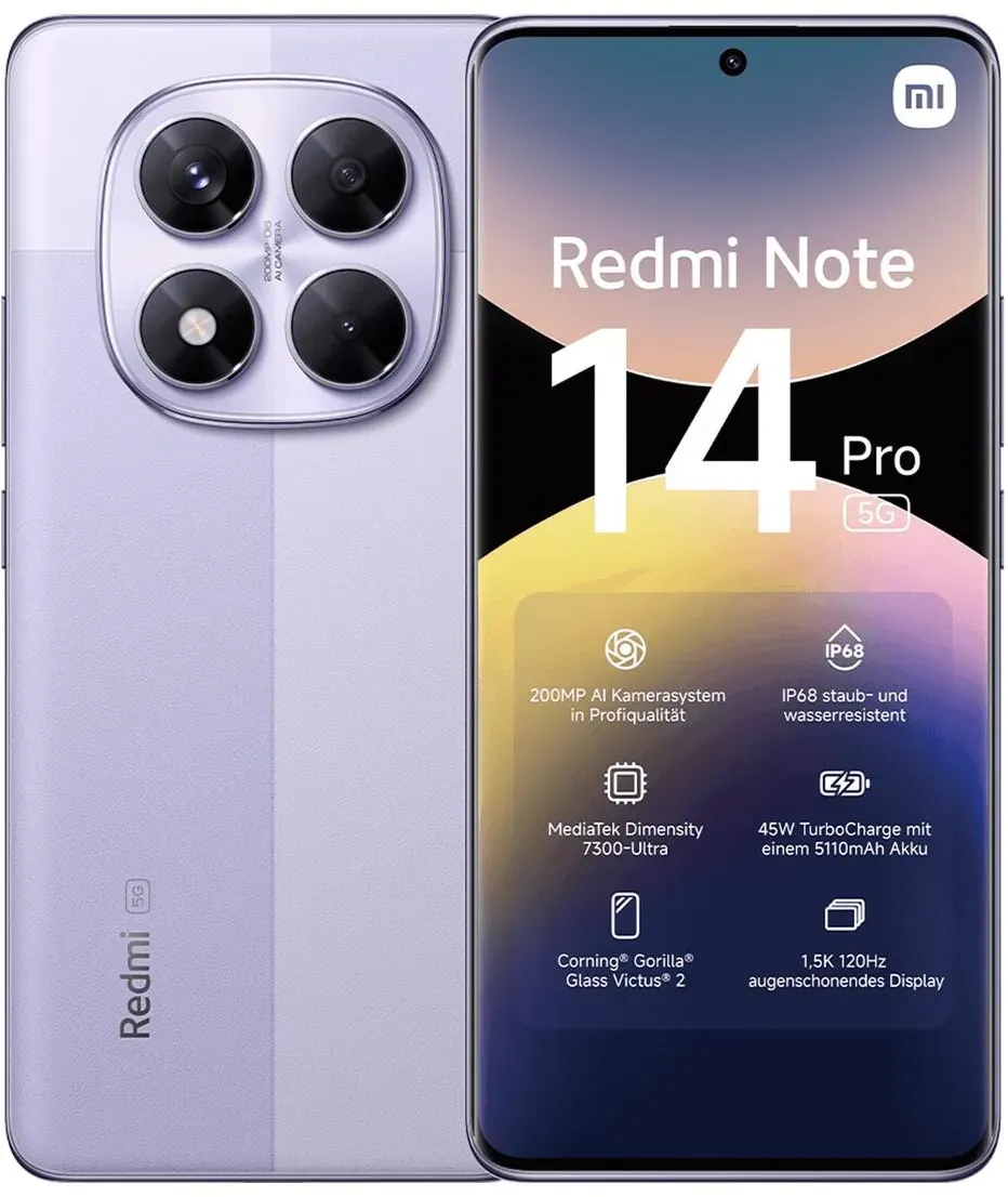 ![]() ![]() Xiaomi Redmi Note 14 Pro 5G (256 GB, Lavender Purple, 6.67', Dual SIM, 5G), Smartphone, Violett