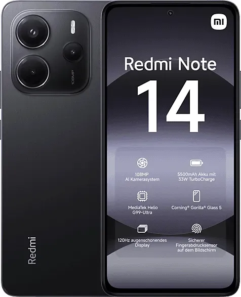 Prepaid-Handys PC-System & Mobiles Gerät Mobiles Gerät Mobiltelefon Mobiltelefone - EAN:6932554408008 - Das Redmi Note 14 kombiniert stilvolles Design mit einer Kamera auf beeindruckendem Niveau und hoher Alltagstauglichkeit. In das nur etwa 8 Millimeter dicke Gehäuse dieses Smartphones wurde ein 16,94 cm (6,67') großes AMOLED-Display mit einer maximalen Helligkeit von 1800 cd/m² eingebaut - hell genug für störungsfreie Nutzung auch in hellen Umgebungen und mit einer Touch-Abtastrate von 240 Hz für flüssige Workflows. Kombiniert mit einem Lautsprechersystem mit Unterstützung für Dolby Atmos liefert das Redmi Note 14 ein intensives Filmerlebnis in der Handfläche - mit einer Wiederholrate von 120Hz. Das Kamerasystem bietet drei Linsen auf der Rückseite und eine leistungsfähige Selfie-Kamera auf der Frontseite. Zu den Kamera-Features zählen ein verlustfreier 3-fach Zoom, Makroaufnahmen und umfassende Bearbeitungsfunktionen mit KI-Unterstützung. Dabei ist das Gehäuse des Redmi Note 14 nach IP54 gegen Spritzwasser und Staub geschützt - auch nasse oder ölige Finger stellen bei der Bedienung des mit Corning Gorilla Glass 5 geschützten Touchscreens kein Problem dar. - gefunden von Kelkoo Dieses Modell bietet 256GB Speicher zu einem sehr günstigen Preis, was es zu einer guten Wahl für Nutzer mit höherem Speicherbedarf macht. ![]() Xiaomi Redmi Note 14 256GB, Handy