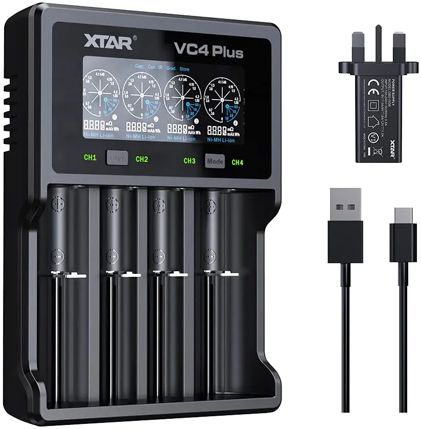Auf LagerXTAR VC4 Plus Akku-Ladegerät, inklusive QC3.0-Adapter, lädt Liion und Ni-MH-Akku gleichzeitig, 3 A Schnellladegerät, 4 Bay wiederaufladbares Batterieladegerät (VC4 Plus + UK-Adapter)