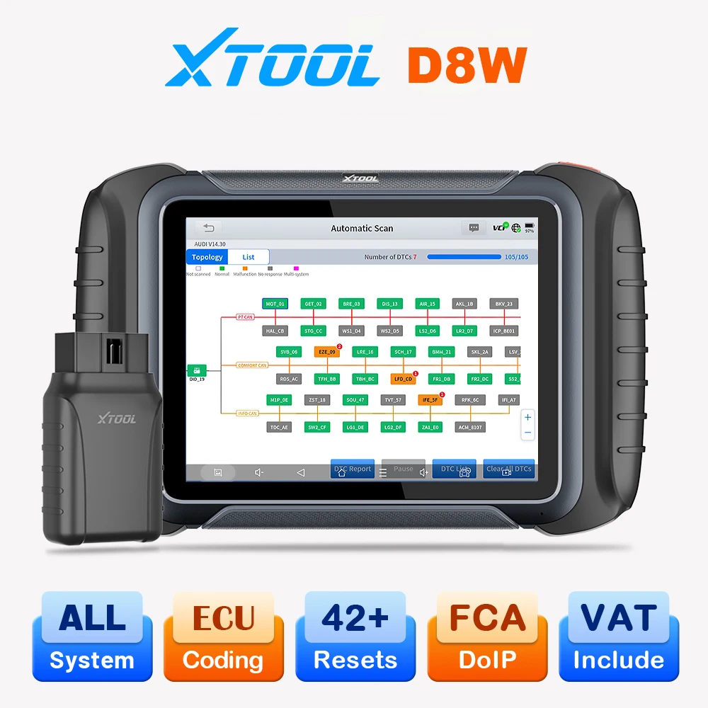 XTOOL - XTOOL D8W Autodiagnosetools Kfz-Scanner Komplettsystem-ECU-Codierung Aktiver Test OBD2-Scanner 42+ Resets CAN FD DOIP FCA - bei de.aliexpress.com - aus Yadore Produktdaten Dieses Angebot ist eine verbesserte V2.0 Version des D8W mit zusätzlichen Funktionen wie Schlüsselprogrammierung und Bluetooth, was es zu einer vielseitigen Wahl macht. ![]() XTOOL D8W V2.0 Kabelloses Kfz-Diagnosegerät mit 42+ Funktionen, Topologie-Karte, Schlüsselprogrammierung für Schlüsselzubehör, ECU-Codierung, OBD2 Bidirektionale Steuerung, Bluetooth-Scanner, CANFD