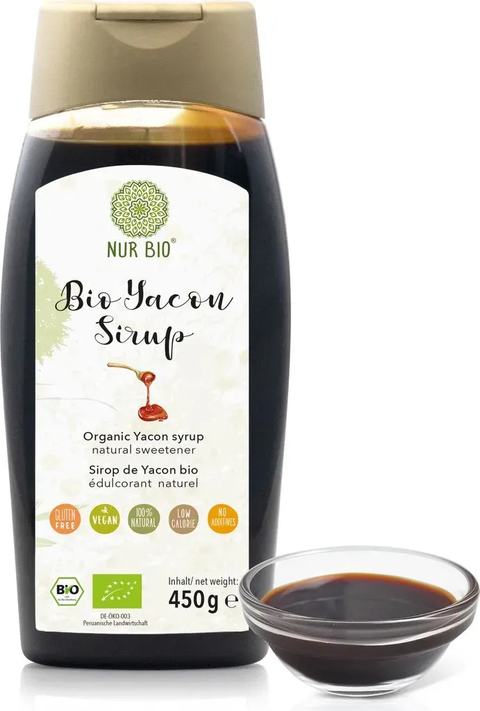 2 Händlerangebote bei billiger.de - Kategorie: Diät - Kräuterhaus Sanct Bernhard - Die lecker-süße Alternative. Yacon (Smallanthus sonchifolius) ist eine in Südamerika heimische Pflanze, die seit Jahrhunderten als Nahrungsmittel genutzt wird. Der aus den saftig-süßen Wurzelknollen gewonnene Sirup ist eine ausgezeichnete, leckere Alternative zu herkömmlichem Kristallzucker. Sein hoher Gehalt an Fructo-Oligosacchariden (FOS) und unverdaulichen Ballaststoffen macht Yacon-Sirup zu einem niedrig-glykämischen Süßstoff mit geringem Kaloriengehalt und somit interessant für alle, die ihren Zuckerverzehr reduzieren wollen.Unser 100 % reiner, naturbelassener Bio-Yacon-Sirup wird aus Yaconwurzeln hergestellt, die nach streng ökologischen Grundsätzen in Peru angebaut werden. Er zeichnet sich durch einen wunderbar milden Geschmack mit leichter, fruchtiger Süße aus.Yacon-Sirup kann sehr vielseitig eingesetzt werden und eignet sich vorzüglich zum Süßen beispielsweise von Getränken, Desserts und Müslis, aber auch zum Kochen und Backen. - GTIN:4250382208228 Dieser Bio Yacon Sirup von Golden Peanut ist eine hochwertige, vegane und zusatzstofffreie Süße aus der Yaconwurzel. ![]() ![]() Golden Peanut NurBio® Yacon Sirup BIO 450 g - natürliche Süße aus der Yaconwurzel, ohne Zusätze, höchste Reinheit, vegan, Bio DE-öKO-003