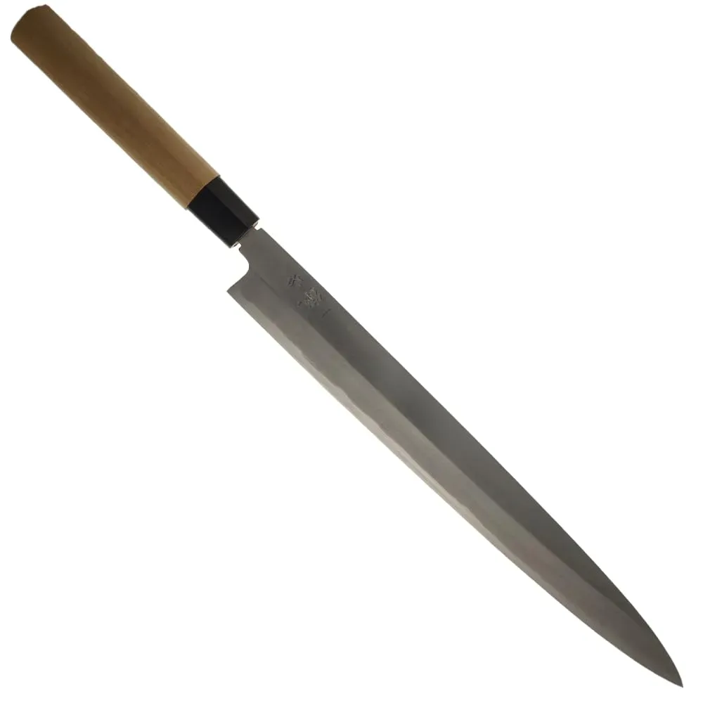 Kategorie: Küchenmesser - SHIZU HAMONO - GTIN:0768813150410 - Japanisches Koch-Messer für feine Scheiben, Fleisch, Fisch. Für Sushi, Sashimi, Carpaccio.Hochwertige Verarbeitung, müheloses Schneiden Hersteller Shizu Hamono aus Seki. Hochburg für die Messer-Herstellung. Renommierter Hersteller für traditionelle und moderne Küchenmesser Material: Japanischer Kohlenstoff-Stahl (High carbon) AUS-8, hochwertiger Edel-Stahl SUS1A-1. 3 Lagen, Härte 59-60 HRC, Anschliff beidseitig Von Hand geschmiedet. Außenhaut rostfrei. Glänzendes, poliertes Finish. Sehr leicht und scharf. Langanhaltende Schärfe, leicht zu schleifen Maße Gesamt 330mm, Klinge 205mm, Gewicht nur 130g. Empfehlung schonende Handwäsche, schärfen mit Wasser-Schleifstein, gut trocknen - 159,00 Euro bei Amazon Marketplace Home - gefunden von billiger.de Ein handgeschmiedetes Yanagiba mit Shirogami 2 Stahl, das für seine extreme Schärfe und Schnitthaltigkeit bekannt ist und sich an erfahrene Nutzer richtet. ![]() ![]() Generisch Yanagiba Japanisches Messer Ittetsu Forge-welded Shirogami 2 IJF-11127 33cm