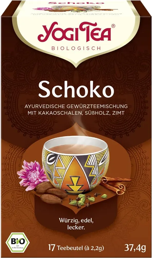 27 Händlerangebote bei billiger.de - Kategorie: Tee - YOGI TEA GmbH - Yogi Tea Classic - Ayurvedischer Bio Gewürz- und Kräutertee mit Zimt, Kardamom, Ingwer exotisch, wärmend, inspirierend Kräutertee mit einer Mischung aus Zimt, Ingwer, Kardamom, Nelken und Pfeffer 100% natürliche Zutaten, 100% Bio Teebeutel 100% kompostierbar, recyclebare Verpackung mit einer Yoga-übung auf jeder Packung und einer Weisheit an jedem Teebeutel koffeinfrei vegan Der Tee, mit dem die Geschichte von Yogi Tea begann Diese wunderbare Mischung aus süßem Zimt, Kardamom, würzigem Ingwer, Nelken und Pfeffer inspirierte Generationen von Yogis sowie die Marke Yogi Tea und legte den Grundstein für die Vielfalt der ayurvedischen Teemischungen von Yogi Tea. Am besten gesüßt und mit Milch oder einer veganen Milchvariante genießen. - GTIN:4012824400016 - PZN:09687441 Der Yogi Tea Schoko Bio ist eine interessante und beliebte Sorte für Teeliebhaber, die etwas Besonderes suchen. ![]() ![]() Yogi Tea Schoko Bio 6 x 37,40 g