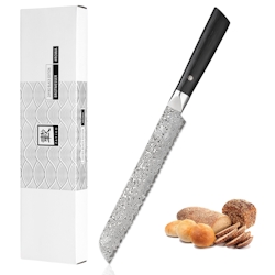Kategorie: Küchenmesser - Zayiko - GTIN:4250567709878 - PRäZISE WELLENSCHLIFF-KLINGE: 20 cm lange Damastklinge mit Wellenschliff schneidet Brot, Baguette und Backwaren sauber, ohne zu zerdrücken, ideal als Krustenmesser für weiche und harte Brote HOCHWERTIGER DAMASTSTAHL: 67 Lagen mit VG10 Schneidkern, Härtegrad 60 2 HRC, langlebig, korrosionsbeständig und mit kompromissloser Schärfe für exakte Ergebnisse in der Küche ERGONOMISCHER PAKKAHOLZGRIFF: Handgefertigter Holzgriff liegt sicher in der Hand, ausgewogene Balance zwischen Klinge und Griff ermöglicht müheloses Schneiden und präzise Kontrolle ELEGANTES DESIGN: Dunkle Damaststruktur mit Black Edition Finish verleiht dem Brotschneidemesser moderne Optik, stilvolles Küchenwerkzeug für ambitionierte Köche und Hobbybäcker GESCHENKBOX INKLUSIVE: Geliefert in edler Box, perfekt als Geschenk für Messerliebhaber, Hobbybäcker oder Köche, vielseitiges Brotmesser und Bäckermesser für Haushalt und Gastronomie - 119,00 Euro bei Amazon Marketplace Home - gefunden von billiger.de ![]() Zayiko Black Edition Brotmesser I 20cm Klinge mit Wellenschliff I dunkler Damast I Pakkaholz
