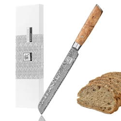 Zustand: Neu - Brotmesser - zayiko Oleio - 1DM-BRE-KNO - EAN: 4250567707065 - MESSEREIGENSCHAFTEN: Brotmesser mit Wellenschliff, Messerlänge 34 cm, Klingenlänge 20 cm. 67 Lagen Damaststahl mit VG10 Kern, Härtegrad 60±2 HRC, präzise Schneidleistung für Brot und Brötchen KLINGENTECHNOLOGIE: Der spezielle Wellenschliff sorgt für saubere Schnitte durch knusprige Krusten und weiche Innenstrukturen, ohne das Brot zu zerquetschen. Ideal auch für Braten und großes Obst ERGONOMISCHER GRIFF: Ausbalancierter Griff aus Birkenwurzelholz mit natürlicher Maserung. Symmetrische Form, für Rechts- und Linkshänder geeignet, gewährleistet sicheres und ermüdungsfreies Arbeiten EINZIGARTIGE OPTIK: Jede Damastklinge zeigt eine individuelle Struktur, jedes Griffstück ein einzigartiges Maserungsbild. Dadurch wird jedes Messer zu einem unverwechselbaren Einzelstück in der Küche GESCHENKBOX: Lieferung in einer hochwertigen Geschenkbox, die sichere Aufbewahrung und eine ansprechende Präsentation ermöglicht. Damit eignet sich das Brotmesser auch hervorragend als Geschenk - Verkäufer: OLEIO GmbH im amazon.de Marketplace ![]() ![]() Zayiko Kinone Damast Brotmesser mit Wellenschliff I 20 cm Klinge I Wurzelholzgriff Birke