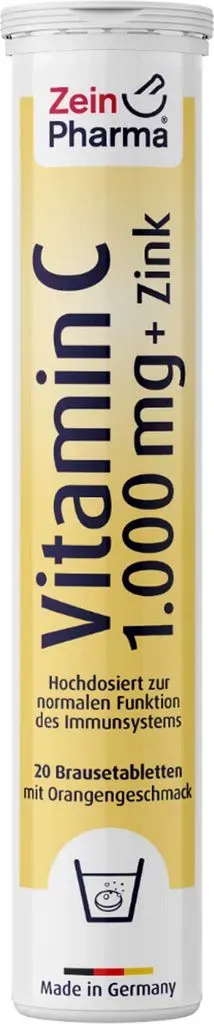 Verfügbarkeit: 1-2 Werktage - 0,12 €/Stück - Kategorie: Nahrungsergänzungsmittel - ZeinPharma - GTIN:4260085384525 - PZN:16623909 - Anwendungsgebiet von Vitamin C1000 mg+Zink BrausetablettenVitamin C1000 mg+Zink Brausetabletten ist ein Nahrungsergänzungsmittel für einen konstanten Vitamin-C-Spiegel mit Orangengeschmack.Wirkstoffe / Inhaltsstoffe / ZutatenVitamin C1000 mg+Zink Brausetabletten enthält: Zutaten:Säuerungsmittel: Citronensäure, Säureregulator: Natriumhydrogencarbonat, Vitamin C, Füllstoff: Sorbit, Stärke, Süßungsmittel: Natriumcyclamat, Aromen, Zinksulfat, Rote Beete Saftpulver (Maltodextrin, Rote Beete Saftkonzentrat), Süßungsmittel: Natriumsaccharin, Farbstoff Riboflavin-5`-Phosphat. Nährwertangaben pro 1 Brausetablette* Vitamin C 1000 mg (1250%**) Zink 10 mg (100%*) * tägliche empfohlene Verzehrmenge **der Referenzmenge lt. LMIVGegenanzeigenBei bekannter überempfindlichkeit gegenüber einem der oben genannten Inhaltsstoffe sollte dieses Produkt nicht angewendet werden.DosierungVerzehrempfehlung von Vitamin C1000 mg+Zink Brausetabletten:1 Brausetablette täglich in reichlich Wasser auflösen und trinken.HinweiseDieses Nahrungsergänzungsmittel ist kein Ersatz für eine ausgewogene und abwechslungsreiche Ernährung und eine gesunde Lebensweise. Die angegebene empfohlene tägliche Verzehrmenge nicht überschreiten. Bewahren Sie dieses Produkt außerhalb der Reichweite von Kindern auf. Vitamin C1000 mg+Zink Brausetabletten können in Ihrer ... Eine sehr preiswerte Option für Vitamin C und Zink in Brausetablettenform. Juvalis.de ZeinPharma Vitamin C1000 mg+Zink Brausetabletten