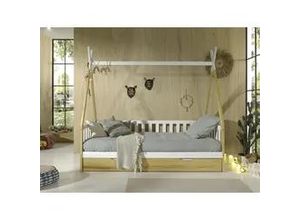 Regale Wohnen Aufbewahren Ordnen - - Das Tipi-Kojen Bett mit Sprossenumrandung und Tipi Aufbau ist etwas Besonderes. Die Bettschublade ist optional. Es verbindet ein vollwertiges Bett mit spielerischer Optik und Stauraumfunktion. Die Ausführung ist Kiefer massiv, teils Natur lackiert, teils weiß lackiert. Das Bett mit der Liegefläche ca. 90 x 200 cm ist universell im Kinderzimmer einsetzbar. Die obere Querstange kann noch hübsch mit Textilien dekoriert werden. Ein Rolllattenrost mit 17 Leisten gehört zum Lieferumfang. Der Artikel zeichnet sich durch hochwertige Verarbeitung und gute Stabilität aus. Die Bettpfosten haben ein Maß von ca. 60 x 30 mm, die Bettseite ist ca. 9 cm hoch. Der Abstand vom Boden bis Oberkante Bettseite sind 29 cm. Für die Matratze steht eine Einlegetiefe von ca. 5 cm zur Verfügung. Die einzelnen Sprossen im Rücken und den Seiten sind ca. 6 cm breit und im Abstand von ca. 6,9 cm verbaut. Insgesamt hat die Bettumrandung eine Höhe von ca. 65,5 cm und die Distanz zwischen Umrandung und 60 mm starken, oberen Querstange ist ca. 90,7 cm. Die Bettschublade bietet zusätzlich Stauraum für Decken oder Bettwäsche. Die Front und Seiten sind aus massiver Kiefer weiß lackiert. Sie hat ein Innenmaß von ca.: B: 194 x H: 17 x T: 90 cm. Die Bodenplatten sind durchgehend und Dekor beschichtet. Sie ist auch für eine Matratze im Maß 90 x 190 cm geeignet, max. Matratzenhöhe ist 17 cm. Durch die Rollenführung und die beiden Griffaussparungen in der Front lässt sie sich ... Dieses Natur24 Tipi Zelt-Kojenbett von Vipack ist eine hochwertige und vielseitige Lösung für Kinderzimmer, die sowohl Schlafplatz als auch Spielbereich bietet. ![]() ![]()