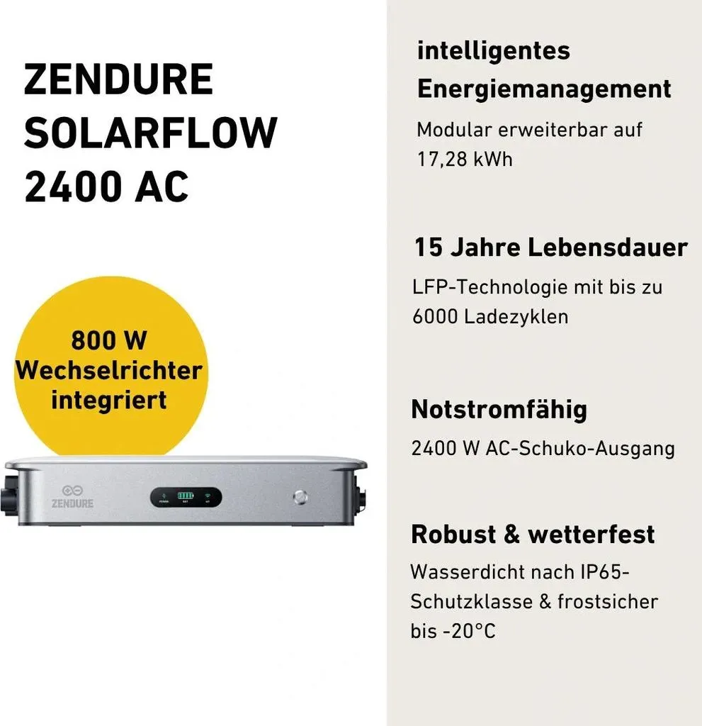 Verfügbarkeit: Die Lieferzeit beträgt 5-7 Werktage - Kategorie: Stromspeicher - Zendure - GTIN:4251297396871 - Zendure SolarFlow 2400 AC Mikrowechselrichter + AB3000X Batteriespeicher 2,88 kWh €” AC-gekoppeltes Heimspeichersystem mit integrierter KI Entdecke die neue smarte Energielösung Tagsüber versorgt dich der SolarFlow 2400 AC mit Solarstrom und speichert überschüssige Energie in der Batterie. Abends speist die Batterie den gespeicherten Strom über den SolarFlow 2400 AC ins Hausnetz ein. Das effiziente Energiemanagement verringert deinen Strombezug aus dem Netz €“ und senkt deine Energiekosten. Mehr Energie speichern €“ mehr Geld sparen Dank modernster Halbleitertechnologie der dritten Generation erreicht unser System einen AC-Rundlaufwirkungsgrad von bis zu 93 %. So holst du das Maximum aus deiner Energie heraus €“ für höhere Effizienz und maximale Einsparungen. Das HEMS €“ Effizienz neu gedacht für eine nachhaltige Zukunft Das HEMS* €“ unser intelligentes Home Energy Management System €“ vereint Solarstromerzeugung, Energiespeicherung und Verbrauchsoptimierung in einem nahtlos integrierten digitalen ökosystem. Unterstützt durch den KI-basierten Optimierungsmodus ZENKI analysiert das System in Echtzeit Daten wie Wetterprognosen, Batteriestatus und Strompreise, um den Energieverbrauch intelligent zu steuern. ZENKI passt sich fortlaufend Ihrem Energiebedarf an und hilft Ihnen, monatlich bis zu 42 %** Stromkosten zu sparen.* Das HEMS ... Ein Set mit dem Wechselrichter und zwei AB3000X Speichern, das eine erweiterte Speicherkapazität für höhere Anforderungen bietet. ![]() ![]() Zendure SolarFlow 2400 AC Bidirektionaler AC Speicher mit HEMS zum nachrüsten 2 x AB3000X