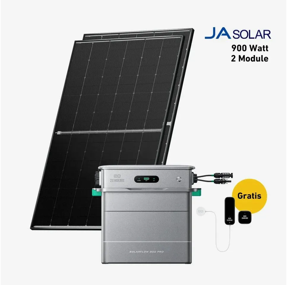 Verfügbarkeit: lieferbar-in 4-5 Werktagen bei dir - Kategorie: Solaranlagen - balkonstrom - GTIN:4262493930844 - Produktdetails Jahresertrag , 656 kWh/Jahr, Anzahl Module , 4, Zelltyp , Monokristallin, Modulwirkungsgrad , 22,5 %, Eigenschaften , JA-Solar 450 Wp bifazial Solarmodul ¢ Modul-Stecker: Stäubli EVO2 ¢ STC Leistung: 450 Wp ¢ Rahmenfarbe: schwarz eloxiert ¢ Zelltechnologie: bifazial ¢ Zellenzahl: 108 ¢ Maße in mm: 1762 x 1134 x 30 mm (LxBxH) ¢ Gewicht: 22 kg ¢ Kabellänge plus: 1200 mm ¢ Kabellänge minus: 1200 mm ¢ Herstellungsort: China ¢ 2 Produkt- und 3 Leistungs Zendure Solarflow 800 Pro ¢ Batterietechnologie: LiFePO4 ¢ Speicherkapazität: 1920 Wh ¢ Eingangsspannung: 14-55 V ¢ PV-Eingänge: 2 ¢ Bidirektionale AC-Leistung: 800 W ¢ OffGrid Leistungspeak: 1000 W Notstrom ¢ Max. PV-Eingangsleistung: 2.640 W ¢ Anzahl MPPT: 4 ¢ Ausgangsspannung: 230 V ¢ Nennfrequenz: 50Hz ¢ Ladetemperatur: 0° C bis 55° C ¢ Entladetemperatur: -20°C bis 55°C ¢ Schutzart: IP65 ¢ Konnektivität: WLAN (2,4 GHz) & Bluetooth ¢ Speicherkompatibilität: Zendure AB1000, AB1000S, AB2000, AB2000S und AB2000X ¢ Maße: 338.6 Ã 226 Ã 358 mm ¢ Gewicht: 25.9 kgZendure Smart Meter D0 D0 Reader: ¢ Eingangsspannung: (USB-C): 5V DC, (AA-Batterien): 3V DC ¢ Nennleistung: 1W Max ¢ Kommunikationsfrequenz: 868MHz ¢ Betriebstemperatur: -20°C bis 50°C ¢ Produktabmessungen: 98,47 Ã 37 ... Mit 1352.89 Euro und 0% MwSt. ist dieses Set mit 5,76kWh und 2x AB2000X Erweiterungsbatterien eine attraktive Option für mehr Speicherkapazität. ![]() ![]() Zendure SolarFlow Set 5,76kWh 800 Pro mit 2x AB2000X Erweiterungsbatterie - 0% MwSt. (gemäß§12 Abs.3 UstG**)