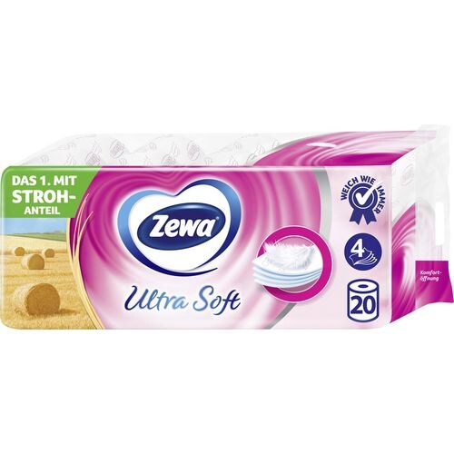0,75 € / 1 Rolle - Kategorie: Hygieneartikel - Zewa - GTIN:7322540739527 - Das Zewa Ultra Soft Toilettenpapier mit ultimativer Weichheit. Zewa Ultra Soft verwöhnt Sie mit 4 extra weichen Wohlfühllagen und bleibt dabei doch stark und sicher. Das geprägte Federmuster sowie das Zewa Logo in zartem Rosa unterstreichen die weiche Struktur von Zewa Ultra Soft. - 15,05 Euro bei hygi.de - gefunden von billiger.de ![]() ![]() Zewa Ultra Soft 4-lagig 20 Rollen