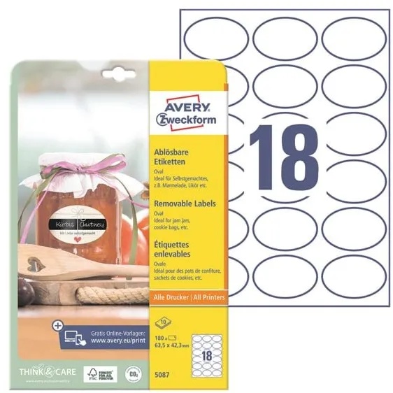 Zustand: Neu - 0,05 € / stück - Universal-Aufkleber - AVERY Zweckform - 5087 - EAN: 4004182050873 - 180 selbstklebende, ovale Aufkleber im Format 63,5x42,3mm - mit Top Klebkraft auf verschiedenen Untergründen - bei Bedarf ganz einfach und ohne Kleberückstände wiederablösbar Ideal für jede Art von Kennzeichnung oder Beschriftung - von Marmeladengläsern, Selbstgemachtem, Aufbewahrungsboxen oder Schubladen bis hin zur Kennzeichnung von Büromaterial, Mappen oder Unterlagen Umweltfreundlich: FSC-zertifiziertes Papier aus verantwortungsvoll bewirtschafteten Wäldern und anderen kontrollierten Quellen Gestochen scharfes Druckbild ohne Verwischen - rt staufreier Druckerdurchlauf auf allen gängigen Laser- und Inkjet-Druckern ohne Klebstoffablagerungen zu hinterlassen Blanko Etiketten einfach selbst gestalten und bedrucken mit kostenlosen Online-Vorlagen von AVERY Zweckform - den Link hierzu finden Sie auf der Produktverpackung oder auf der AVERY Zweckform Website - 14 Händler im amazon.de Marketplace Bueroshop2 4.de 180 AVERY Zweckform Etiketten 5087 weiß 63,5 x 42,3 mm