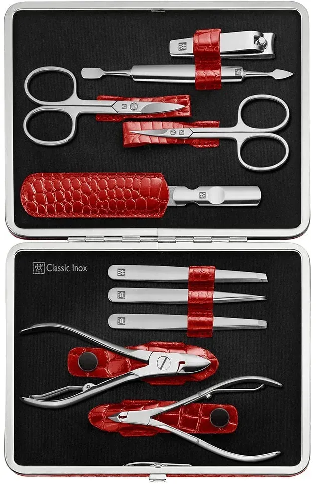 Zustand: Neu - John Frieda Aktion - ZWILLING Zwilling - 97509-004-0 1007362 - EAN: 4009839306839 - Komplettes Nagelset: 10-teiliges Maniküre und Pediküre Set zur umfassenden und komfortablen Pflege der Finger- und Fußnägel aus der Classic Serie Design: Schwarzes Rindleder-Etui mit Metallrahmen in Kroko-Optik und innenseitigem Samtbezug. Ergonomische Form der Instrumente. Optimaler Begleiter für unterwegs oder auf Reisen Material: Die Instrumente sind aus hochwertigem, rostfreiem und poliertem Edelstahl gefertigt, korrosionsbeständig und nickelfrei Geschenkidee: Ob für sich selbst oder zum Verschenken. Für Weihnachten, Valentinstag oder Geburtstag Lieferumfang: Bestehend aus Nagelknipser, 2 in 1 Maniküre Instrument, Nagelschere, Hautschere, Saphir- Nagelfeile, schräge Pinzette, gerade Pinzette, spitze Pinzette, Nagelzange und einer Hautzange - bei Amazon.de Dieses 10-teilige Classic Maniküre Set in Rot ist ein umfangreiches Set für die komplette Nagelpflege. ![]() ![]() Zwilling Classic Maniküre Set 10-teilig in Rot