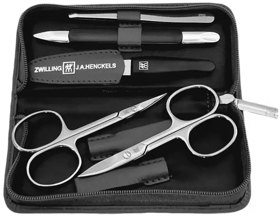 Zustand: Neu - Sets & Kits Maniküre- & Pediküre-Sets - ZWILLING Zwilling - 97440-004-0 - EAN: 4009839493263 - Pflegeroutine: 3-teiliges Set mit den wichtigsten Nagelpflegeinstrumenten für die tägliche Maniküre und Pediküre aus der Classic Serie Design: Schwarzes Rindleder-Etui mit Druckknopfverschluss und innenseitigem Samtbezug. Ergonomische Form der Instrumente. Optimaler Begleiter für unterwegs oder auf Reisen Material: Die Instrumente sind aus hochwertigem, rostfreiem und poliertem Edelstahl gefertigt, korrosionsbeständig und nickelfrei Geschenkidee: Ob für sich selbst oder zum Verschenken. Für Weihnachten, Valentinstag oder Geburtstag Lieferumfang: Bestehend aus 2 in 1 Kombi-Nagelschere, Saphir-Nagelfeile und einer schrägen Pinzette - bei Amazon.de Dieses 5-teilige Maniküre-Set für 59.90 Euro bietet eine umfassende Ausstattung für die Nagelpflege in einem praktischen Etui. ![]() ![]() Zwilling €“ Maniküre Set 5-teilig - Manicure - Nagelschere - Pinzette - Nagelpflege - Reißverschluss-Etui - Leder-Etui - 13,8 x 6,5 x 2,5 cm - schwarz