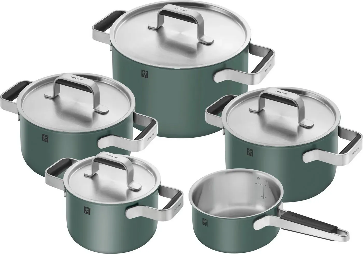 lieferbar-in 2-3 Werktagen bei dirZwilling Topf-Set Pure, Edelstahl 18/10 (Set, 5-tlg., 3 Kochtöpfe (16, 20 & 24 cm), Bratentopf 20 cm, Stieltopf 16 cm), Stay-Cool-Griffe, 3-lagige Bodentechnologie grün